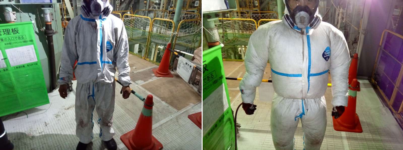 保護衣は全く通気性が無いので、冷風が常に充満してモコモコになります。夏でも快適に作業が可能になりましたが、たまに寒すぎてクーレットを外す人もいるぐらいです。最強ですね。