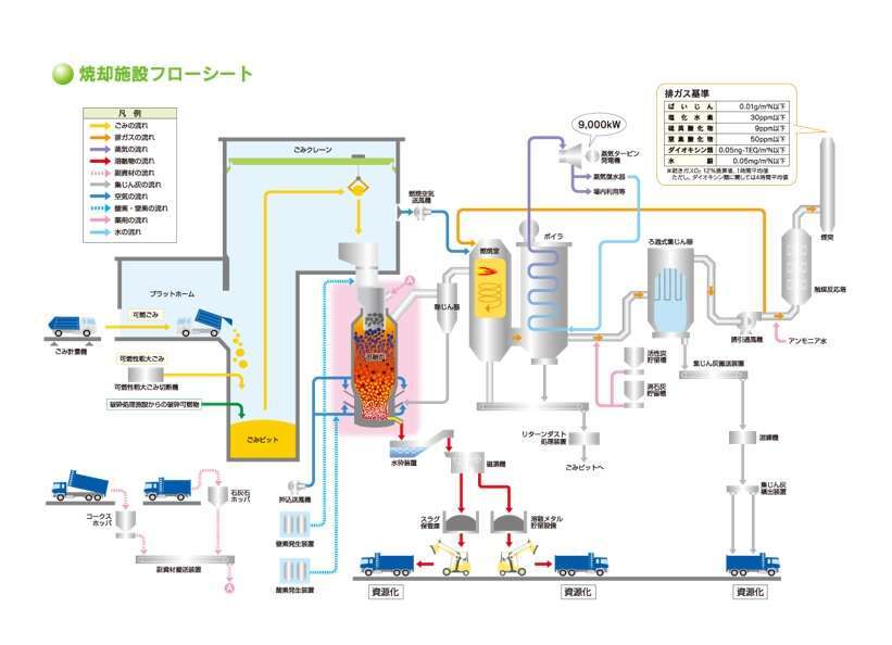 ごみ処理施設では、可燃ごみを燃やし、その熱を利用して発電を行います。そして燃え殻はアスファルトなどの燃料になります。プラスチック・アルミ缶などは細かく破砕しリサイクルされます。世間ではあまりきれいなイメージはないですが、とても大切な施設です。