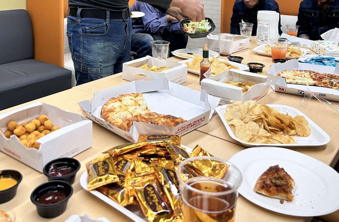 会社の休憩室を少しだけ飾り付けて、みんなでわいわいピザパーティー。