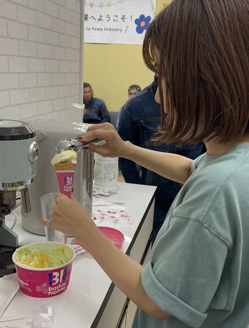…が、アイスが想像以上にカチカチで、すくうのが大変…!出来上がったアイスを社長にへたくそ(的なこと)と言われたので、「では、社長もやってみてください」ということで代わりに作ってもらったのですが、結局、これは無理だわと納得してくれました。