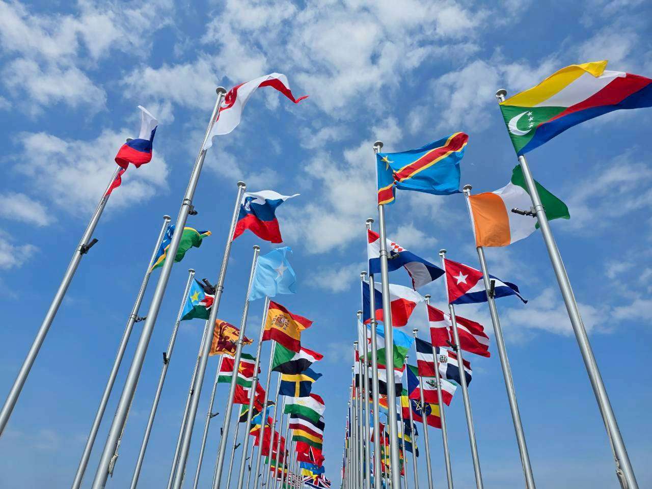 入場ゲートでは、各国の国旗がずらりと並んでおり、青空も相まってとてもきれいでした。到着時はカンカン照りの晴天で、気温も高め。ですが、会場内には給水ポイントや自販機が多数設置されており、熱中症対策がしっかり取られていました。