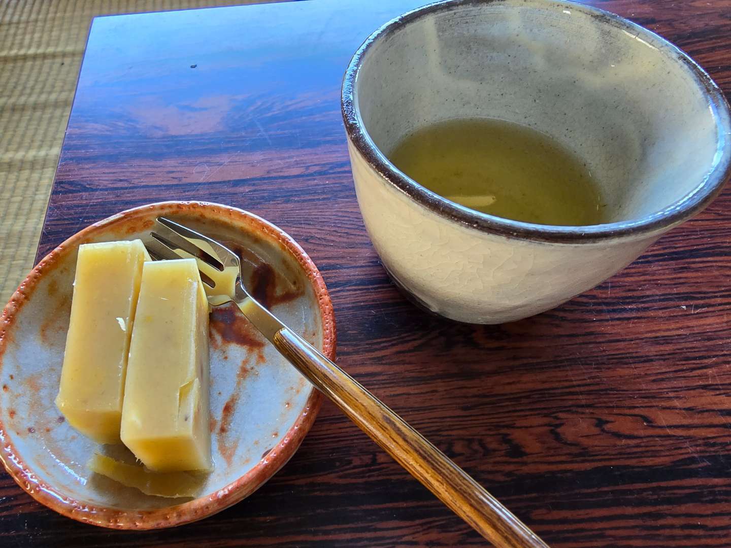 体験会では複数のお茶を飲むことができ、合間に気になるお茶を何度も飲みました。そして、午前のおやつ、美味しい手作りの栗ようかんを食べて、畑に出発です!