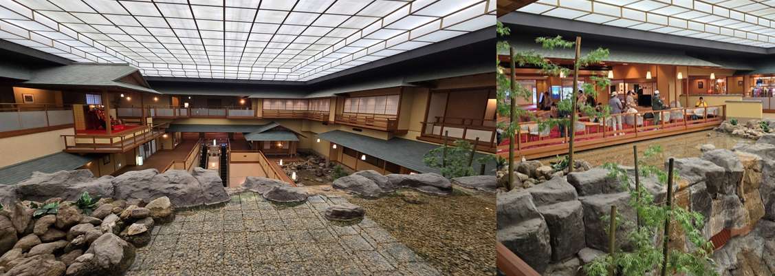 エントランスを抜けると、広くて和風な旅館に「おぉー!」と圧倒されます(あちこち散策したくなる気持ちを一旦抑えます)。鬼滅の刃に出てくる「無限城」のようと言われるそうです(私はあまり詳しくないのですが)。館内が広く、部屋へたどり着くまでに迷子になりそうです。