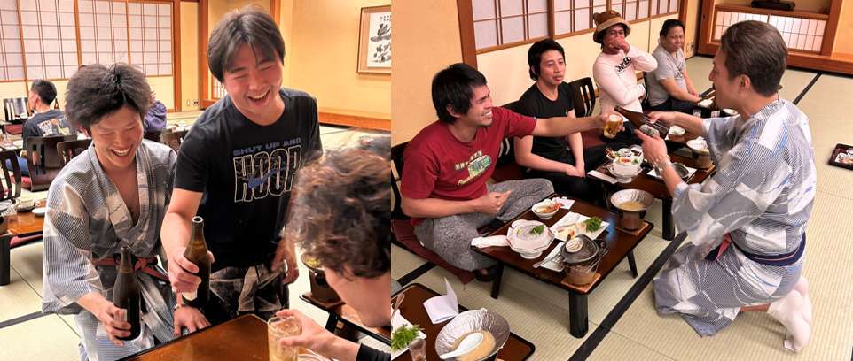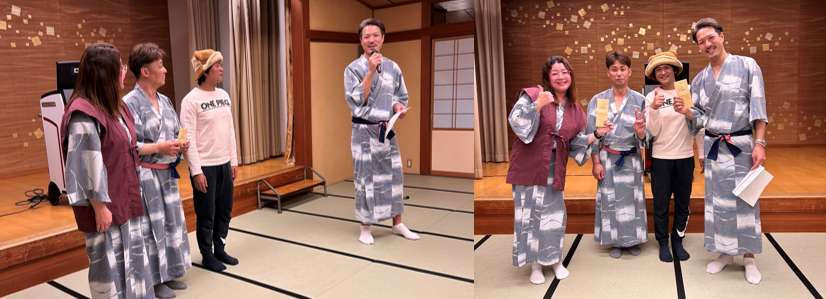 お風呂上りで浴衣の人もいれば、実習生たちは浴衣を知らず(廊下にあったので自由に着ていいかも知らなかった様子)、みんな私服でした。日本人は半数以上が浴衣でした。新鮮です。