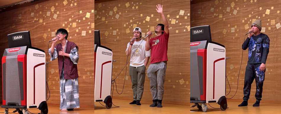 トップバッターは、趣味で音楽をしている工事課のKさん!期待は高まるばかり(私はこれまで歌声を聴いたことがありませんでした)。発声練習から始まり、本格的です。お酒も入り、本人も気持ちよさそうに熱唱。