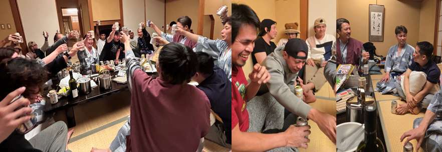 みんなで部屋に集まり、乾杯!部屋で眠る人もいれば、お風呂に入る人もいて、自由な空間でした。